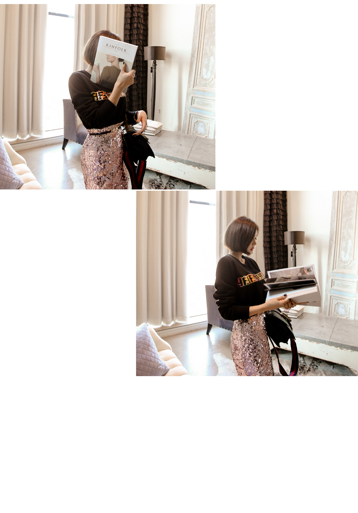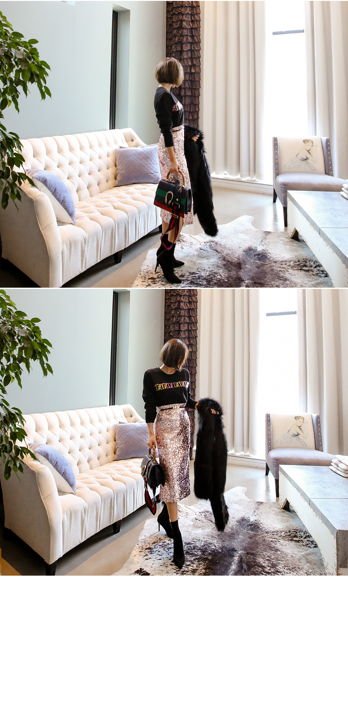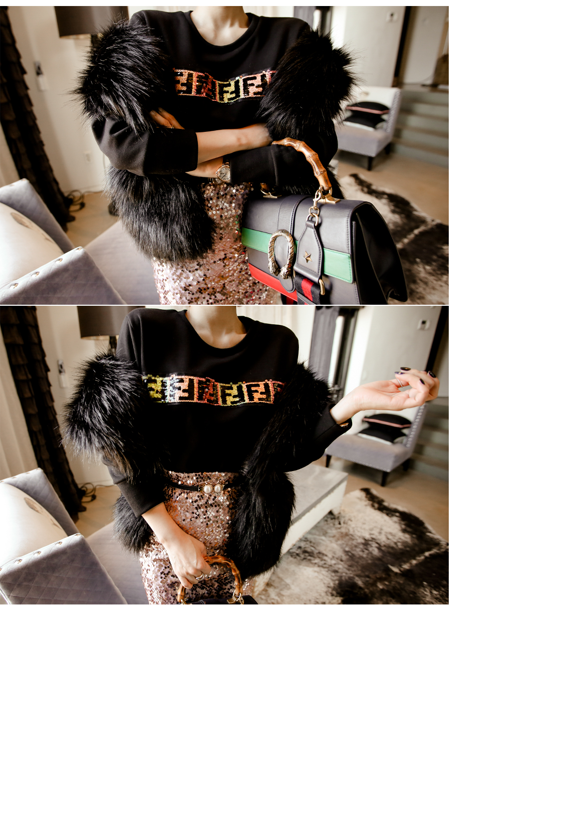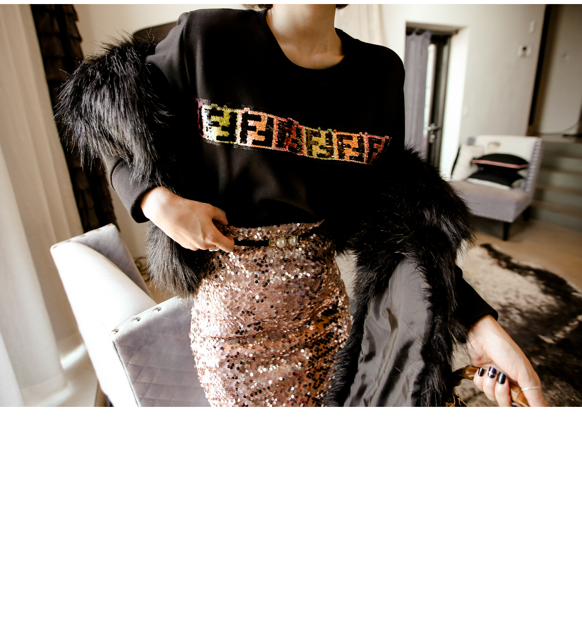輝くスパンコールの装飾が前面にあり、