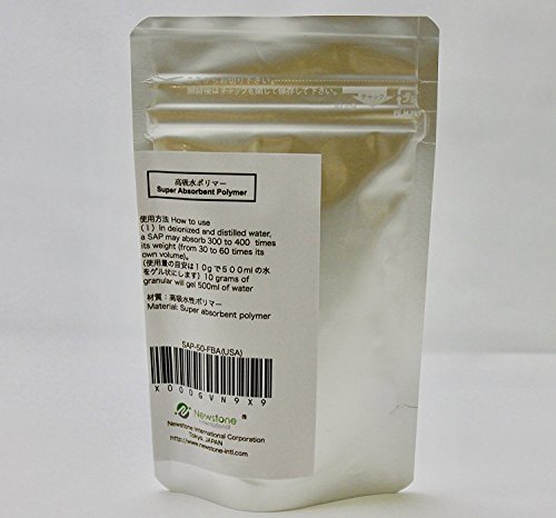 - JAN/EAN code:4571403370509, Made in Japan, Color is White/Creamy color, Size of Granular is approx. 0.38mm(380microns) , Net Weight is 50g or 1.76oz. Superabsorbent Polymer - Sodium polyacrylate, also known as the diaper polymer **NOTE** Please note that Newstone products is MADE IN JAPAN. If you purchase from other seller's we cannot guarantee its quality and orgin.