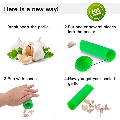 - SOLID STAINLESS STEEL & Dishwasher Safe: The Garlic Press/Crusher/Chopper is made of stainless steel, which is resistant to rust, making it perfectly safe to clean in the dishwasher. The Garlic Peeler is made of FDA and ROHS -approved silicone materials and have been added bulgy points in the inner layer to help peel the garlic more efficiently. These cooking gadgets will last as long as you need them.