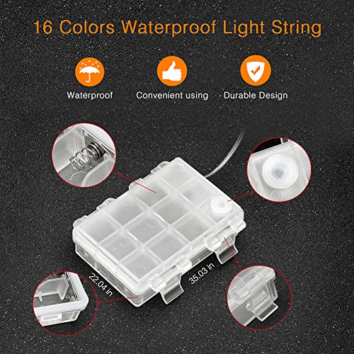 100% Waterproof -- Both string lights and battery case are fully sealed. Perfect for outdoor using. No worry for rain and water. Put them into your water fountain to create amazing water scene.