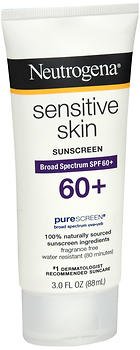 Help keep your sensitive skin protected with Neutrogena Sensitive Skin Sunscreen Lotion with Broad Spectrum SPF 60+. Formulated for sensitive skin, this gentle sunscreen provides UVA/UVB protection to help prevent sunburn. Its formula contains Purescreen technology with 100 percent naturally sourced physical sunscreens, including titanium dioxide and zinc oxide. This unique blend provides hypoallergenic, fragrance-free, oil-free, and water-resistant protection for sensitive skin.Feature