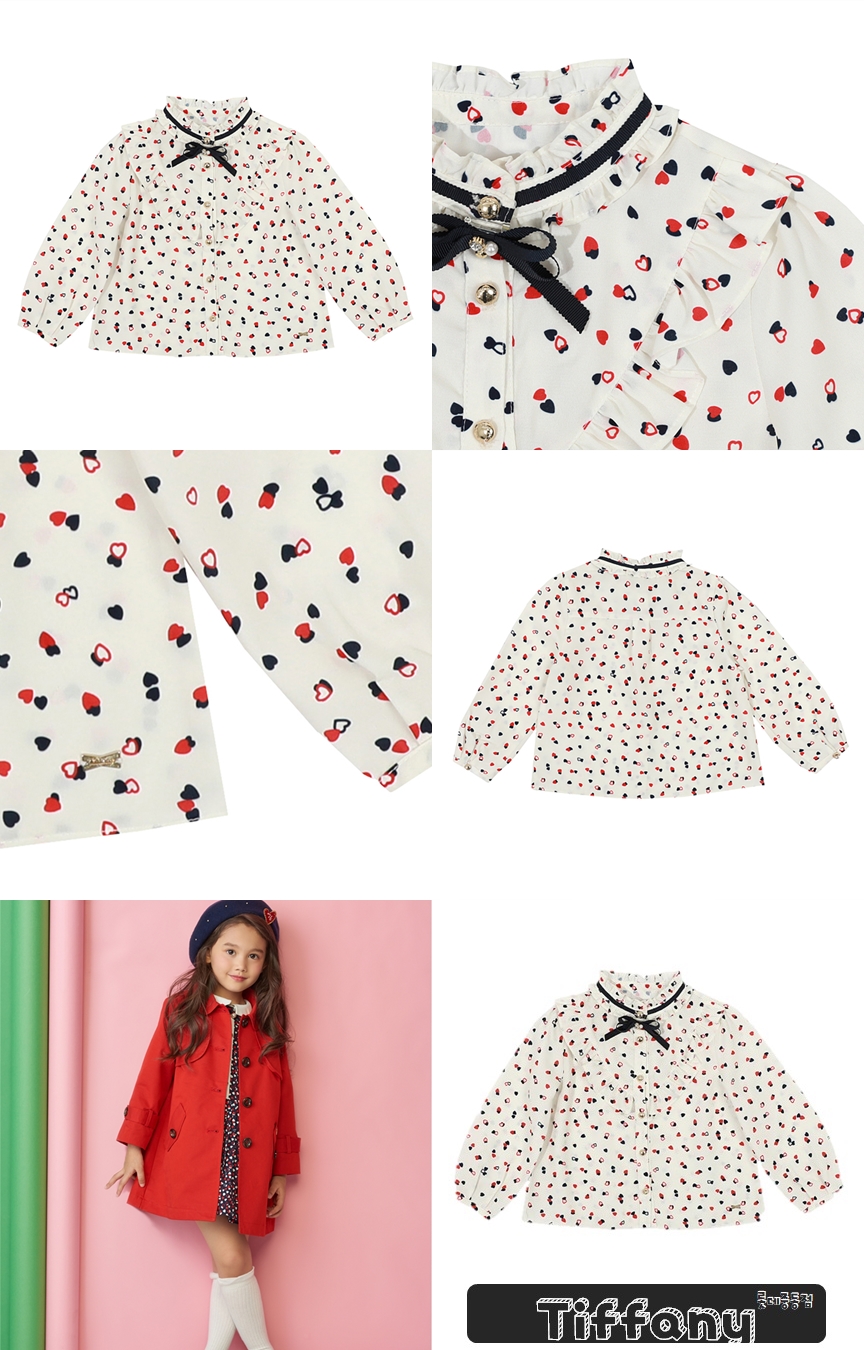 귀여운하트패턴의 아이보리 브라우스로에리프릴과 가슴프릴이 포인트인 아이템으로 탈부착브로찌가 구성되어있습니다.