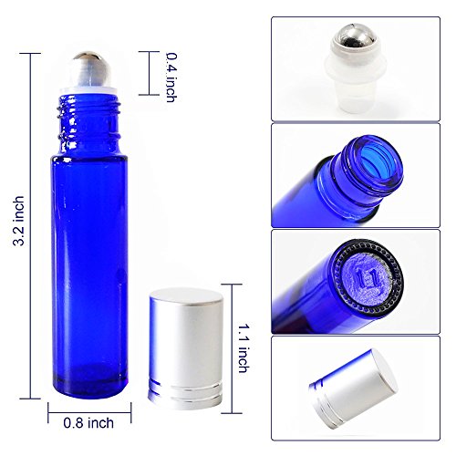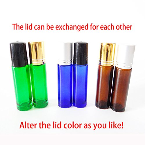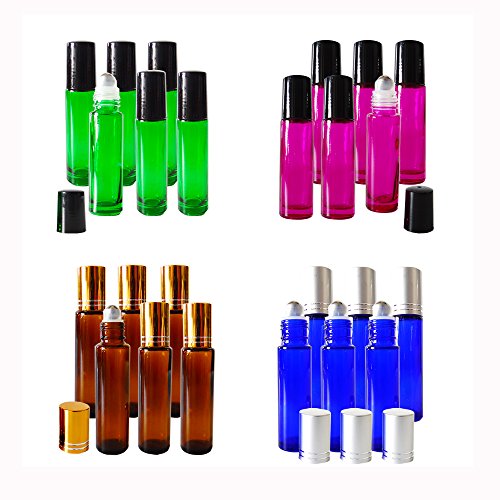 - Complete Bundle - 24x 10ml/0.33oz Empty Glass (6x Amber + 6x Blue + 6x Rose Red + 6x Green) Roll-on Bottles with lids w/ free 3x 3ml droppers + 3x mini funnels + extra 8 roller balls + 2x essential oils bottle openers + 36 pieces labels