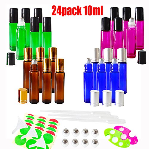 24x 10ml Empty (Amber+Blue+Rose Red+Green) Glass Roll-on Bottles for Essential Oil w/ free 3x 3ml Dropper, 3x Mini Funnels, 2x Bottle Openers, Extra 8...