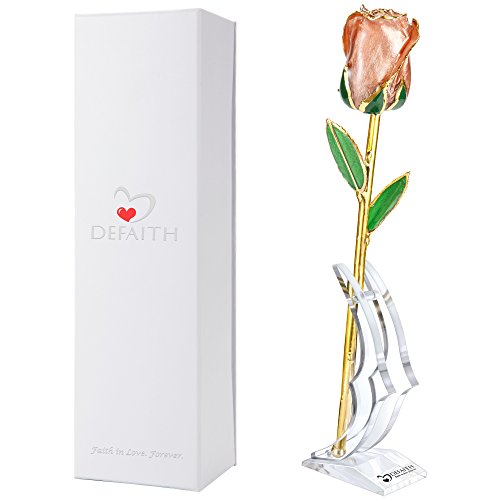How DEFAITH® produce these Gold Rose Through a special process a real rose is coated in lacquer and then trimmed in 24kt gold to preserve the rose's original stunning beauty and color. Each gold rose is preserved by hand through an extensive process.These specialty roses are chosen at the peak of their bloom. They then go through a lengthy series of steps that ensures that the breathtaking roses maintain their brilliant color and bloom. The edges and stems are dipped in 24 K gold to capture the beauty of both the gold and the real rose. The intricate details of the leaves and delicate petals remain visible.