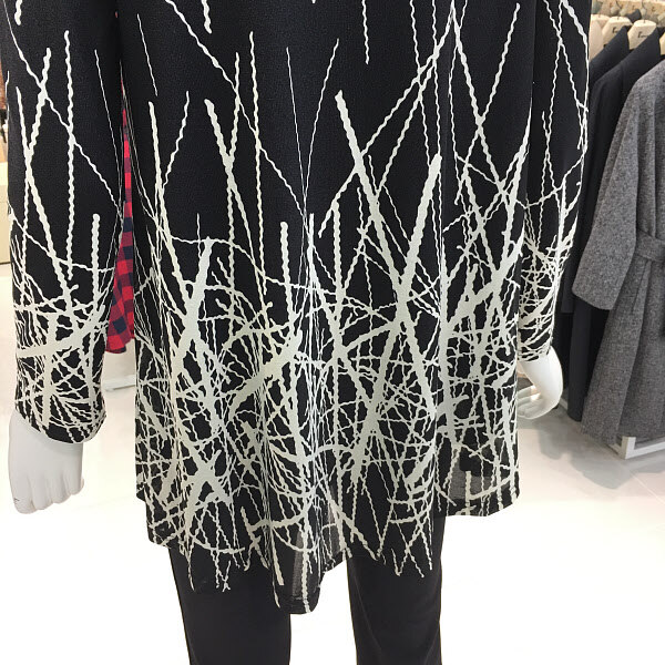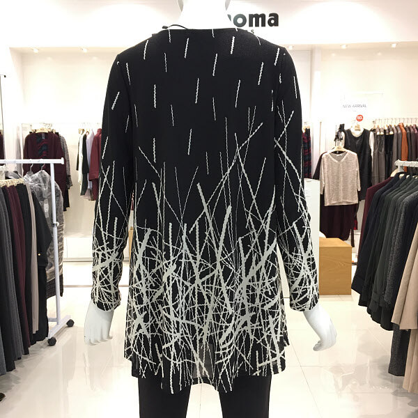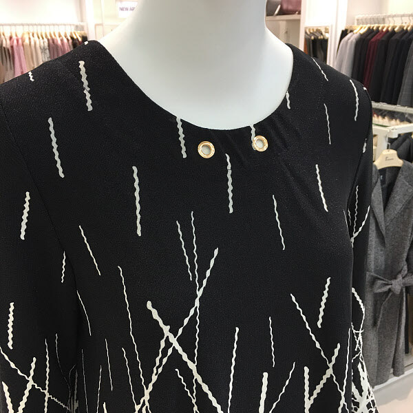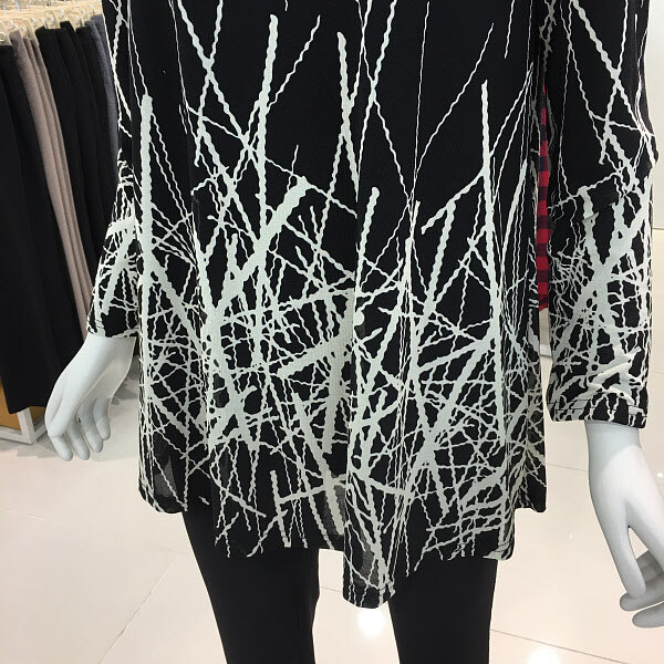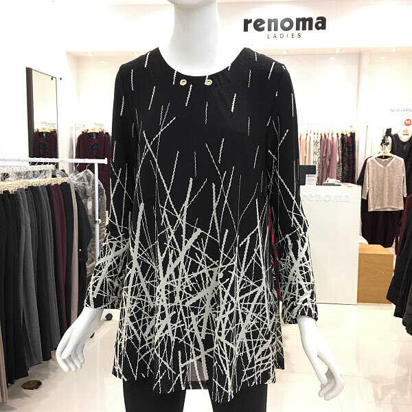 레노마레이디 블랙화이트프린트티셔츠 A라인에 신축성 좋은 프린트티셔츠입니다. 편한 착용감과 여유있는 기장으로 활동성도 좋아요.