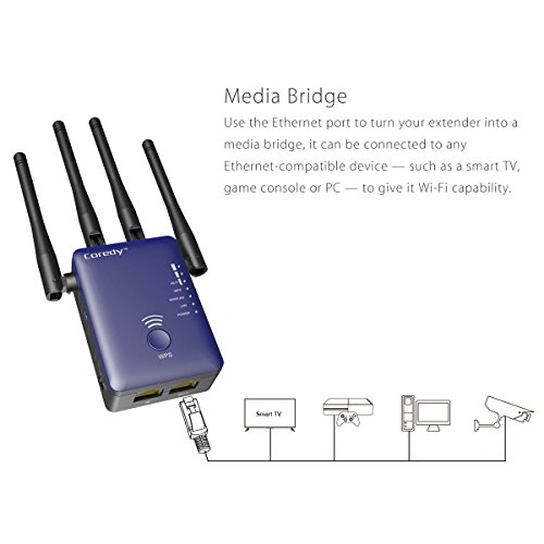 The Coredy CX-E120 is a Universal AC1200 Dual Band WiFi Range Extender, comes with 802.11 ac technology for extending the coverage and improve the signal strength of an existing wireless network and eliminate dead zones. Works with any standard router or gateway. Boost Your WiFi Coverage with AC1200 Dual Band The Coredy CX-E120 Dual Band WiFi Range Extender boosts your existing Wi-Fi coverage, extend wireless network to hard-to-reach areas with 802.11 ac technology, enjoy WiFi in your whole home! Also works as a media bridge. While boosting your existing Wi-Fi coverage, the two Ethernet ports can also connect any wired device such as a smart TV, multimedia player, game console or PC to your WiFi network. Superior Performance with 4x 3dBi External Antennas Simultaneous AC1200 dual band WiFi connections speed up to 5GHz 867Mbps + 2.4 GHz 300Mbps for smoother online gaming or HD movies! The 4 x 3dBi external antennas extend your WiFi to every corner of your home! Easy Installation & Relocation Easily expand wireless coverage at a push of the Coredy CX-E120's WPS button and your router's WPS button. Or, browser-based configuration, accessible from almost any device, including iOS and Android mobile platforms (if your router do not have a WPS button). The smart LED signal indicator provides a simple and clear indication, helps you find the best location. Create a New WiFi Network Anywhere In Access Point (AP) mode, it can be connected to any wired LAN to create a new Wi-Fi Access point, allowing the internet connection to be accessed from laptops, tablets, phones or other Wi-Fi devices. Convenient and Flexible 3-in-1 Repeater, Access Point and Router, Coredy CX-E120 dual band WiFi range extender brings Wi-Fi as the way you need it with its three selectable Work Modes.Feature