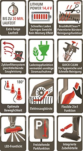 Maximale Leistung ohne Kabel: Der leistungsstarke Lithium Power-Akku - mit 3 Jahren Sicherheit - ermoglicht nonstop eine extra lange Laufzeit von bis zu 30 Min in der Eco-Stufe und 13 Min in der Powerstufe. Die motorbetriebene Saugburste nimmt selbst kleinste Staubpartikel auf und sorgt mit 4 LEDs auch an dunklen Stellen fur beste Sicht