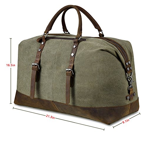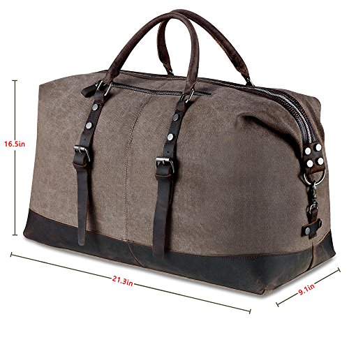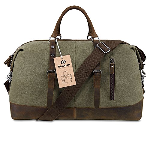-. Feature : Dimensions: 21.2"/9.0"/16.5"(54*23*42cm )(L*W*H), Weight: 1.7KG/ 3.7 pounds, Capacity: 52L / Main Material of BLUBOON travel duffel bag: soft canvas and top quality genuine leather, the canvas material won't rip or tear when you put a lot inside of the tote / The buckles, metal clasps, rivets, clips, zippers and D rings are all of good quality and feel pretty solid, the handles are rounded which makes it comfortable to carry / The overnight bag comes with a large darable adjustable shoulder strap can relax your hands if you prefer to carry it over the shoulder that made toting it around so much easier / The duffel bag is a really good size for the weekend travel, daily travel short business travel, photography lovers do for short trips while flying, on the train, on the bus, or in any form of transportation. And you can managed to get things inside that you need to take, and it has multiple interior pockets that help keep your things organized