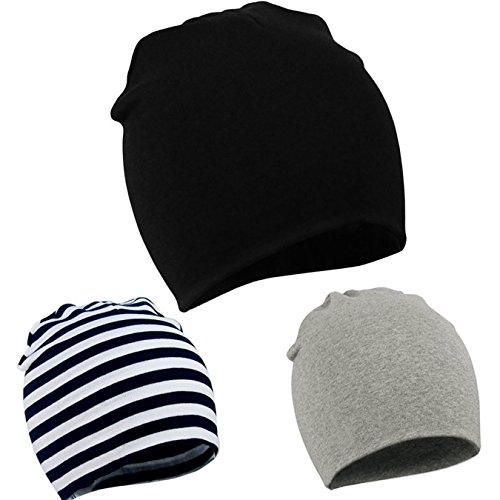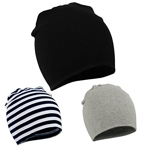 Zando Cotton Toddler Beanies Soft Baby Cap Infant Boy Girl Plain Hats Cute Unisex Warm Knit Beanies for Winter A 3 Pack Black Stripe Light Grey Large (1-4 years)