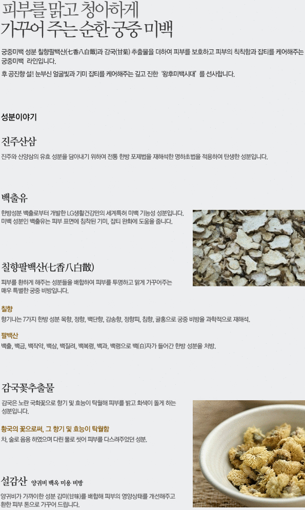 | A pure and rich textured whitening essence, which is made by the precious medicinal herbal and secrets from courts from the ancient times. This manages dark skin blemish and help to provide balanced and transparent skin tone. |