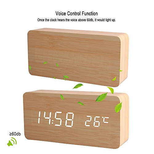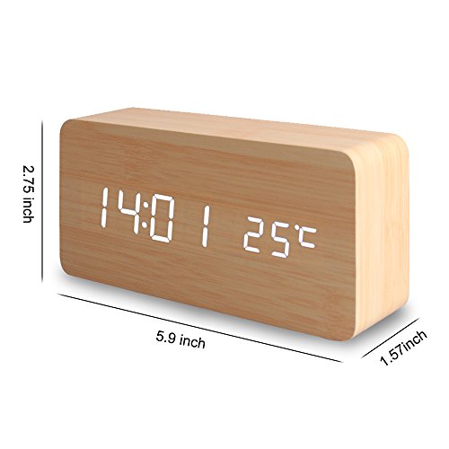 Material : Eco-friendly Wood Color:Wood LED Display Color: White Power source: Batteries or charging cord Brightness: 3-level(hi,med, low) Input: DC 5v/500mA Sound sensor: available for switch on/off Dimensions: 15cm x 7cm x 4cm(1.57W x 2.76H x 5.9D) Net Weight: 6.70OZ