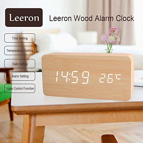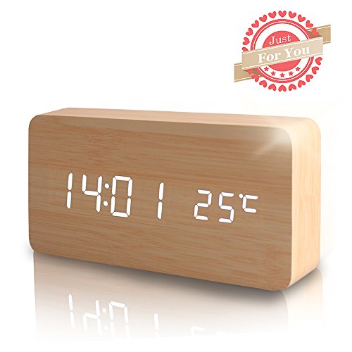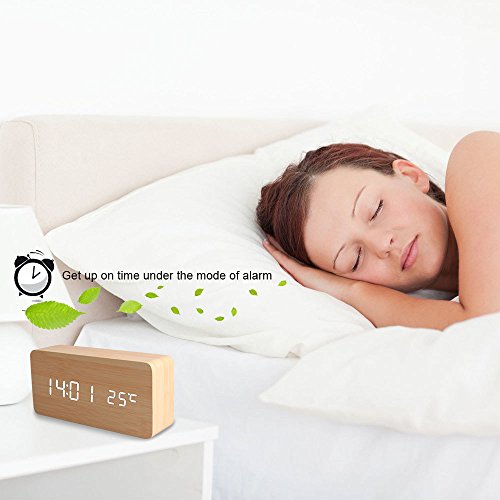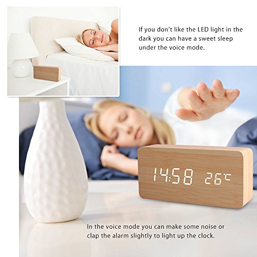 1.This designer LED digital alarm clock is made of wood and its face is enclosed inside the wood. 2.It has LED display of time and date alternately.(time temperature displaying at the same time) 3.It also works in voice mode. Make some noise when clap your hands, rap on the table or pat the clock nearby can wake it up. 4.Alarm function,three alarms, with "beep" lasting for 1 minute. 5.Time display 12-hour or 24-hour mode 6.Thermometer(°C/°F). 7.Powered by USB power supply cable or 4 x AAA batteries(not included). 8.Add a touch of modern to your bedroom, living room or office.