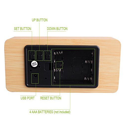If LED display keeps ON and only powered by batteries, battery is easy to waste (Works around 3 days). Please use the USB cable replaces the batteries to charge your clock. Please use the clock in dry area,due to all wooden housing. You May Need to Press the Reset Button to Make it Work at the First time.You Can Find the Reset Button inside the Battery Cover! Packing List: 1 x cube alarm clock 1 x plug cord 1 x User's manual