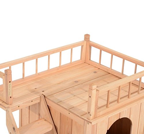 -. Feature : 2-story wooden cat house with roof and weatherproof finish / Includes indoor lounge, climbable stairs and a rooftop balcony with railing / Makes a perfect outdoor shelter for cats and small dogs / Simple assembly with instructions and all hardware included / Overall Dimensions: 28.75"L x 20.5"W x 25.75"H