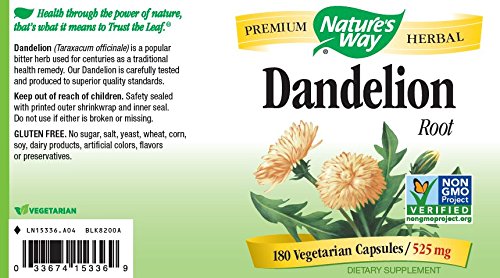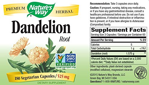 -. Binding : Health and Beauty -. Brand : Nature's Way -. Color : Parent -. Feature : 2 Bottles of Vcaps / Dandelion is a popular bitter with a long history of use as an herbal remedy. / Dandelion's name comes from the French "dents du lion," or "teeth of the lion," due to the shape of the leaf. / Nature's Way dandelion root is imported from Europe -. Label : Nature's Way -. Manufacturer : Nature's Way -. PackageQuantity : 1 -. ProductGroup : Health and Beauty -. ProductTypeName : HEALTH_PERSONAL_CARE -. Publisher : Nature's Way -. Studio : Nature's Way -. Title : Nature's Way Dandelion Root Veg-capsules, 525 Mg, 180-count
