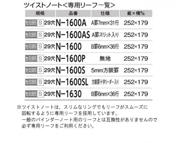 | 仕様 | 規格:セミB5・S型(タテ型)・29穴 リーフ枚数:30枚(B罫6mm×36行) 最大収容枚数:40枚 |