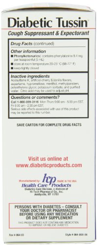 Studio : Diabetic Tussin Publisher : Diabetic Tussin Binding : Health and Beauty Product Description Strong on colds, safe for people with diabetes - #1 pharmacist recommended brand* - Sugar alcohol free - No sodium, sorbitol, fructose, gluten, or dyes - Cherry flavor *U.S. News World Report and Pharmacy Times, 2016-2017 0