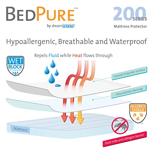 -. Feature : ALLERGY SHIELD Our BedPure Series 200 mattress protector is hypoallergenic and protects you from dustmites, pet dander, dust and other allergens. It is great for people with allergies or asthma. / WETBLOCK TECHNOLOGY Whether you are potty training, have a baby or toddler with leaking diapers, a bedwetter, or someone who suffers from incontinence, this water-proof cover will keep your mattress protected from stains and moisture. / KEEPS YOU COOL Mattress encasements made from plastic, vinyl or rubber, along with thick pee pads, can leave you hot and sweaty. Our cover is made from a breathable, jersey knit material to keep you cool and refreshed. / MACHINE WASHABLE Our premium, mattress protection covers are machine washable for your convenience, so your bed will always be protected, and you can enjoy a restful night of slumber. / AVAILABLE IN MULTIPLE SIZES These protectors come in Twin, Twin XL, Full, Queen and King sizes so you can protect every mattress in your home.