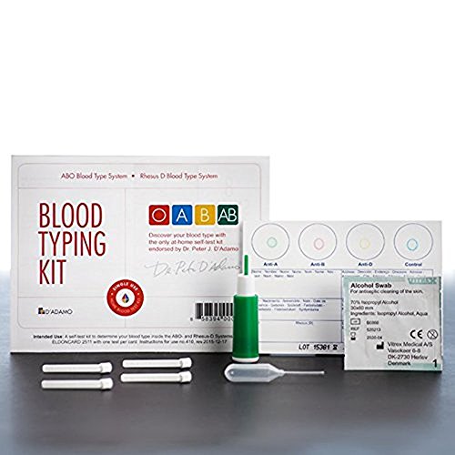 Studio : D'Adamo Personalized Nutrition Publisher : D'Adamo Personalized Nutrition Binding : Health and Beauty Product Description Home Blood Type Testing Kit 1 kit For one ABO and Rh(D) Blood Grouping This kit comes complete with everything you need, including instructions, finger lancet and alcohol prep, plastic applicator sticks and testing card. Performing the test is easy. After first cleaning with the supplied alcohol prep pad, the index or middle finger is lanced with the sterile disposable lancet. The hand is then turned downward and a drop of blood is placed on top of each of the four sticks. The sticks are then applied to the card, and stirred for two minutes. The results are then read from the card. Total time to results is less than five minutes. Single use test - blood The Eldoncard 2511 is produced by Eldon Biologicals A/S, Denmark. North American Pharmacal, Inc. is the sole distributor of the official Eat Right 4 Your Type blood typing kit. (for educational purposes only). 0