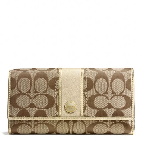 -. Feature : Approx. Measurement: 7 3/4" (L) x 4 1/4" (H) / Signature fabric with patent fabric trim in khaki gold / Credit card and multifunction pockets, Full-length billfold compartments / Removable checkbook holder with pen loop, Zip coin pocket / Snap closure, ID Window