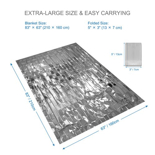 FULLY COVER YOUR BODY & ULTRA COMPACT FOLDED SIZE: 83" × 63" (210 × 160 cm) Emergency Blanket can completely cover your body, holding warmth in all dimensions. The thermal blanket can be folded to a super-compact size of 5" × 3" (13 × 7 cm) with a weight of 47.5 g, extremely suitable for hiking and camping.