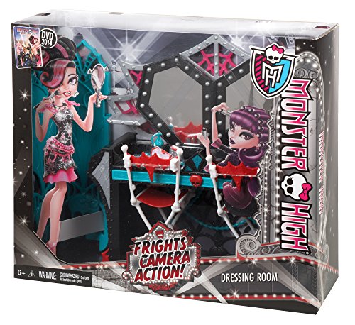 [Description] Frights_ Camera_ Action! The ghouls have made it to Hauntlywood_ and this spooktacular Dressing Room is the perfect spot to turn a monster into a mon-star! Pull up a director``s chair or two - there``s room for two stars on this screen! The double vanity features a web-inspired design_ bat-wing mirror and plenty of counter space Monsteriffic pieces include a coffin-shaped compact_ perfume bottle_ silver brush and other themed pieces