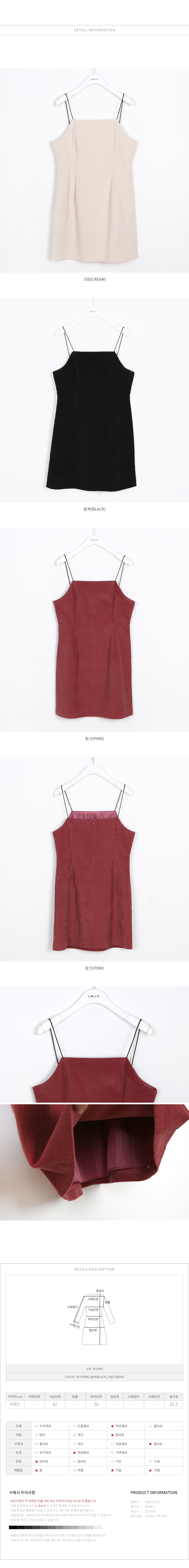![]() "쥬니 골덴원피스" COMMENT 면 100% 골덴으로 매력적인 미니 원피스 소개해드려요:) 얇은 어깨 끈으로 제작되어 거슬림 없이 착용이 가능하며, 여리여리한 무드를 더해드려요! 앞판의 절개선으로 허리라인을 살짝 잡아주며, 그 아래는 에이라인으로 떨어져서 체형커버도 도?드립니다! 전체적으로 안감이 마련되어 있어 부드러운 느낌으로 착용감도 좋답니다! 뒷지퍼로 클로징을 도와주며, 핑크,크림,블랙 컬러로 준비되어 있으며 핑크컬러는 여성스럽고 화사한 느낌을, 크림컬러는 부드러운 느낌을, 블랙컬러는 시크하고 베이직하게 코디하기도 좋답니다! COLOR 핑크(pink),블랙(black),크림(cream) FABRIC 면100% SIZE TIP ?슴42 허리38 밑단51 총장81.5 프리사이즈로 44~마른66 고객님께 잘 맞으실 것 같아요. 트위 모델(키:162)이 착용했을 때 허벅지 중간까지오는 기장감이였어요. (재는 위치 및 재봉과정에 따라 오차가 있을 수 있습니다) *모든의류의 첫 세탁은 드라이크리닝 또는 찬물 손세탁을 해주시는게 좋아요* ![]() ![]() ![]() ![]() ![]() ![]() ![]() ![]() |