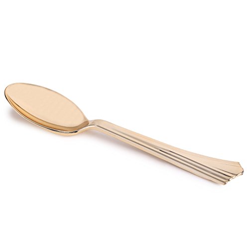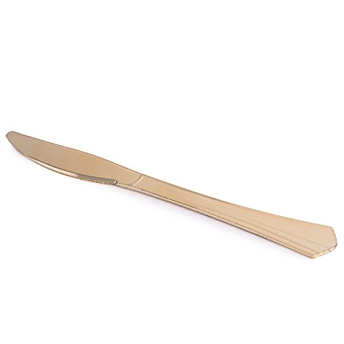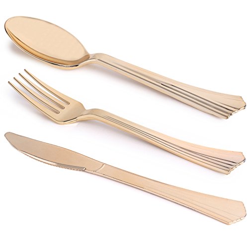 Kaya Collection - Disposable Plastic Gold Silverware Cutlery, Shiny Metallic Flatware 60 Forks, 60 Knives and 60 Spoons Groove Design (180 Pc)
