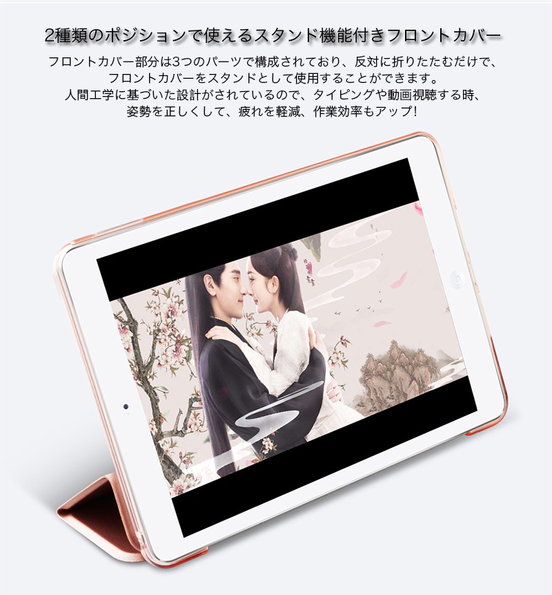 ★「対応機種」iPad mini4(アイパッド ミニ4)、iPad mini3(アイパッド ミニ3)、iPad mini2(アイパッド ミニ2)、iPad mini(アイパッド ミニ)★「カラー」ブルー(青)、ブラック(黒)、ゴールド(金)、レッド(赤)、ローズゴールド★「商品特徴」薄型・軽量設計でありながら割れに強く、安心して装着することができるiPad用カバーです。フロントカバー部分は3つのパーツで構成されており、反対に折りたたむだけで、フロントカバーをスタンドとして使用することができます。人間工学に基づいた設計がされているので、タイピングや動画視聴する時、姿勢を正しくして、疲れを軽減、作業効率もアップ!★「キーワード」iPadmini4 iPadmini3 iPadmini2 iPadmini ケース 手帳型 おしゃれ 耐衝撃 レザー製 ポリカーボネート カバー 衝撃吸収 スタンド機能 放熱性 高級感 かっこいい 作業 便利 マグネット Smart Wake/Sleep機能対応 放熱仕様 ハイクオリティ素材 2アングルタイプ 薄型 軽量 カラフル
