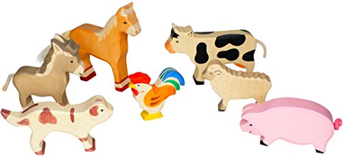 Holztiger Pferd, Kuh, Esel, Schwein, Schaf, Hahn und Hofhund, als Set zusammengestellt von Bambilino