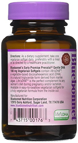Bluebonnet's Early Promise Prenatal Gentle DHA 100 mg Vegetarian Soft gels provide life's DHA, a vegetable-based docosahexaenoic acid (DHA) in a natural triglyceride form derived from marine algae. Life's DHA is the perfect complement to any woman's diet during pregnancy and/or lactation. Available in easy-to-swallow vegetarian soft gels for a truly vegetarian formula from the inside out.Feature