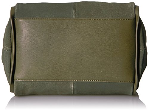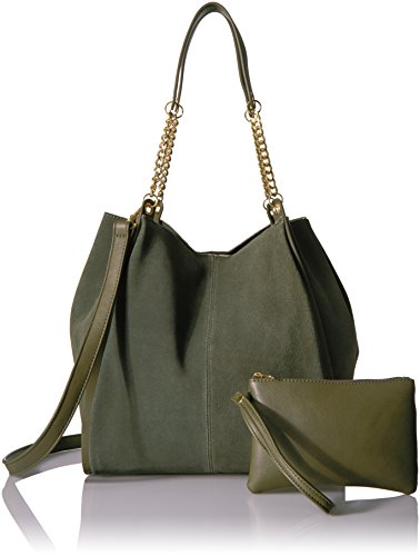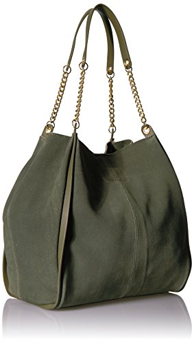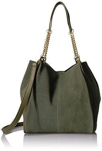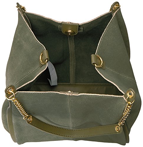 Curb chain straps lend edge to an oversized deconstructed tote in suede.