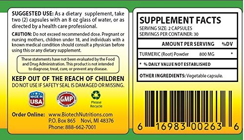 Product DescriptionBiotech Nutrition's Turmeric 800 mg Serving 60 Veggie Capsules All Natural Made In USA0