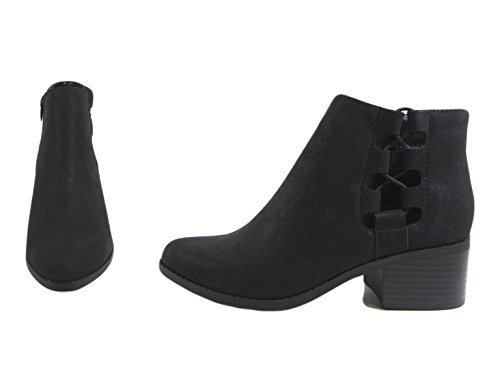 Product Description Add classic fashion with an edge to your wardrobe wearing these booties. Designed with faux suede upper, full lace up tie closure at sides, side zipper closure and chunky block heel. 0