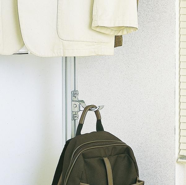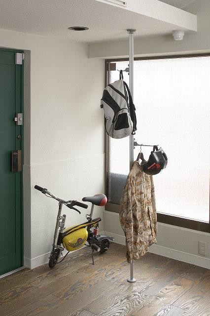床も天井も傷めることなく、つっぱるだけで簡単に設置出来ます。付属のフックで玄関やお部屋で簡単に物掛けが可能。使い方が面白いですよ。