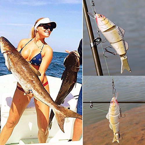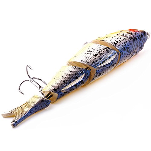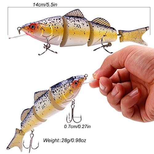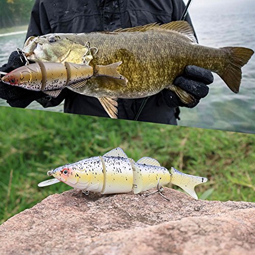 -. Feature : 4-SEGMENT MULTI JOINTED: Sougayilang 4-segment multi-jointed artificial fishing baits with 2 treble hooks, S-swim motion at any speed. / LIFELIKE SWIMMING: Sougayilang Swimbaits Lures , bionic fish body with 3D lifelike eyes, life-like swimming action, easily provoke fish to bite hook. / 17KG/37.5LB STRONG LOADING: Using strong fabric to joint the fish, pulling force up to 17kg, can eaily catch any big fish. / DURABLE & ECO-FRIENDLY ABS MATERIAL: Sougayilang topwater Lures made of high quality ABS material, which is odor-free and environmentally friendly. / WIDELY APPLICABLE: Sougayilang Fishing Bait Hook, can be widely used to catch bass, yellow perch, walleye, pike, muskie, roach, trout in both saltwater and freshwater.