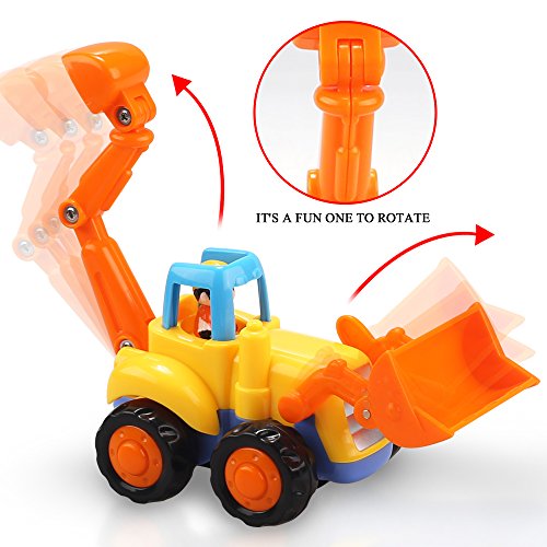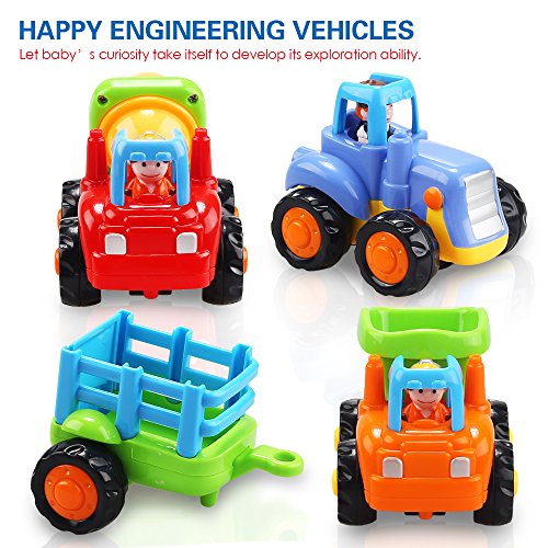 Set of 4 play vehicles for toddlers, includes 1 dump truck, 1 cement mixer, 1 bulldozer, and 1 tractor with a detachable trailer.