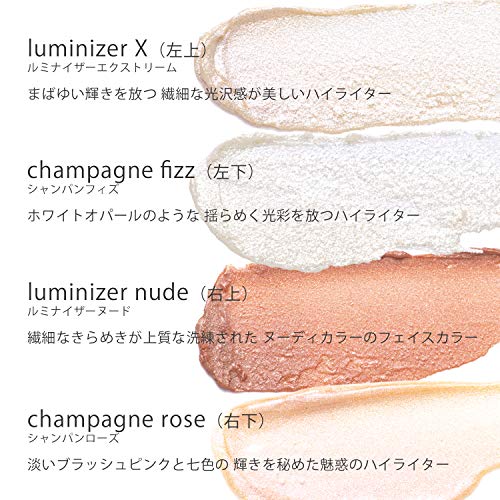 ●左上:ルミナイザーエクストリーム/ ヒマシ油、ヤシ油、ミツロウ、トコフェロール、シリカ、ローズマリー葉エキス、ヒマワリ種子油、マイカ、酸化チタン、酸化スズ ●右上:ルミナイザー ヌード/ ヒマシ油、ヤシ油、ミツロウ、トコフェロール、ローズマリー葉エキス、ヒマワリ種子油、マイカ、酸化チタン、酸化鉄、赤201 ●左下:シャンパンフィズ/ ヒマシ油、ヤシ油、ホウケイ酸(Ca/Al)、ミツロウ、シリカ、トコフェロール、ローズマリー葉エキス、ヒマワリ種子油、酸化チタン、酸化スズ ●右下:シャンパンローズ/ ヒマシ油、ヤシ油、ミツロウ、ローズマリー葉エキス、ヒマワリ種子油、シリカ、トコフェロール、マイカ、酸化チタン、酸化鉄、酸化スズ