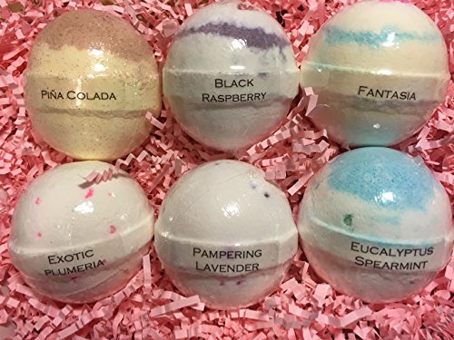 -. Feature : • Eucalyptus Spearmint, Exotic Plumeria, Black Raspberry, Pampering Lavender, Piña Colada, Fantasia / • Bath Bomb Gift Set (Box size: 10" X 7" X 4") - Each Bath Bomb Is Individually Shrink Cello-Wrapped & Tissue Paper-Wrapped, And Packaged On The Bed Of Paper Shred Crinkles For a Beautiful Presentation & a Protection From Breakage. / • Each Aromatherapy Bath Bomb Is 5.2 Oz For A Long Lasting Fizzy Bath Experience And Individually Shrink Cello-Wrapped To Preserve Freshness And Quality From Moisture. / • All Natural, Organic, Cruelty-Free Vegan, Gluten-Free, And Handcrafted With Quality, Pride, Tradition And Innovation Right Here In The United States. / • Ingredients: Each Bath Bombs Is Made With The Finest Food Grade Sodium Bicarbonate, Non-GMO Citric Acid, Vitamin E Oil, Kosher Sea Salt, Organic Shea Butter, Fragrance, Colorant