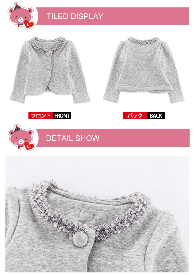 80 着丈27 バスト52 肩幅23 袖丈3190 着丈29.5 バスト57 肩幅24 袖丈32100 着丈32 バスト60 肩幅25 袖丈33110 着丈34 バスト63 肩幅26 袖丈36120 着丈35.5 バスト66 肩幅26.5 袖丈38130 着丈37 バスト70 肩幅27 袖丈40単位:cm※上記サイズは平置き実寸になります。サイズ表の実寸法は商品によって1-3cm程度の誤差がある場合がございます。