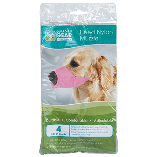 Studio : PetEdge Dealer Services Publisher : PetEdge Dealer Services Binding : Misc. Product Description Guardian Gear lined fashion muzzle is for safety when working with biting, barking and chewing dogs. Each muzzle is crafted in strong nylon fabric and lined with a foam-padded comfort strip. Features finished inner seams for extra support, fully adjustable strap and quick-release buckle. Muzzle stays securely in place, but it's a snap for people to remove and replace. 4 size muzzle fits 8-inch snout size. Available in pink color. Muzzles are the choice of top handlers, trainers and other professionals. Measures 7-4/5-inch length by 4-1/2-inch width by 4/5-inch height. 0