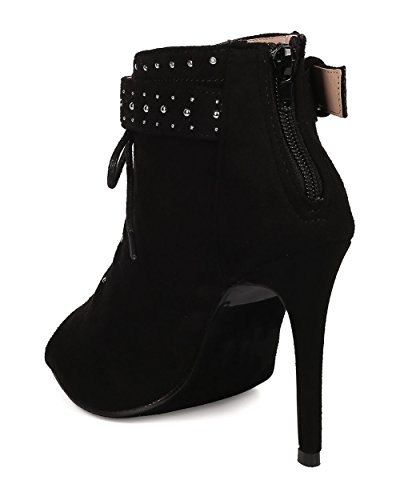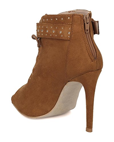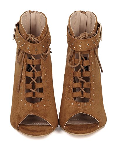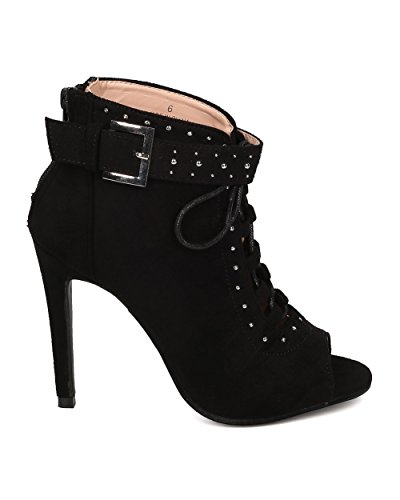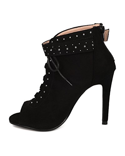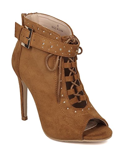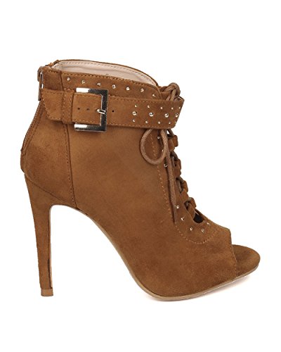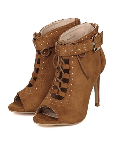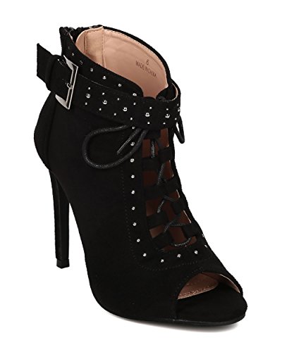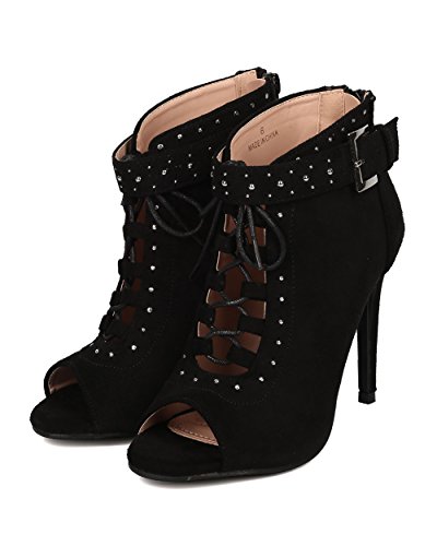Product Description These faux suede booties are made with a peep toe, lace up front and beaded details. Also made with a single sole, stiletto heel and hind zip for easy slip on and off. 0