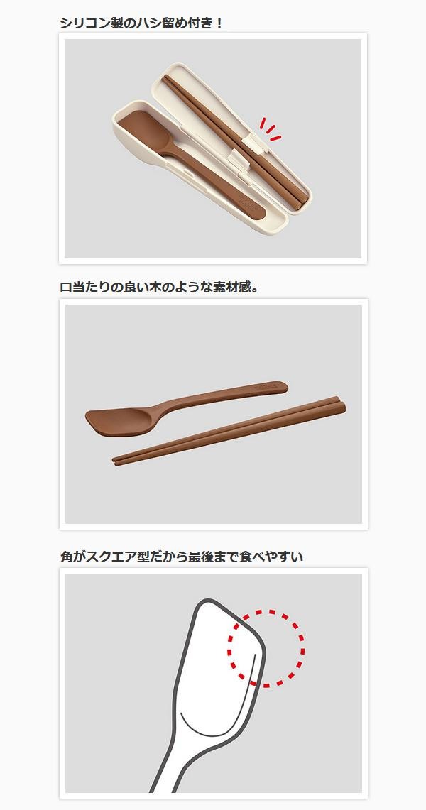 | ケースは、シリコーン製ハシ留め付きなので、持ち運び時にカチャカチャ音が鳴りにくいです。スプーンとハシは、口当たりの良い、木のような素材感&デザイン♪ |