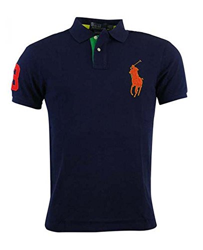Polo Ralph Lauren Mens Custom Fit Big Pony Mesh Polo Shirt (L, Navy Blue/Orange Logo)