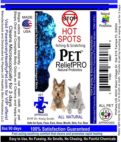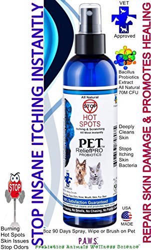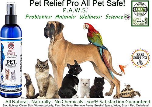 -. Feature : Stop Itching for Dog, pet, cat, bird, pot belly pig, skin irritations, stop hot spots, natural skin healing spray / Natural and cleans microscopically for 3 days, no chemicals, stop itching scratching spray instantly. Wipe, spray or brush on pet. Odorless, soothing, no burning! / Probiotic itching spray made in USA, cleans and builds new healthy bacteria where applied stays on the pet for 7 days. / Removes all pet odors nose, mouth, skin, butt, tail and places in between. Oral, ear, eye, butt safe for soothing, cleaning and repair. Stops ear mites and tear stains with a simple spray or wipe on! / Microscopic deep cleaning, promotes fur growth. Rebuilds good external bacteria to prevent and knock out itching. Eats and removes ear wax, stop ear mites by eating the food source. Chemical Free - All Natural -FREE Continental USA SHIPPING