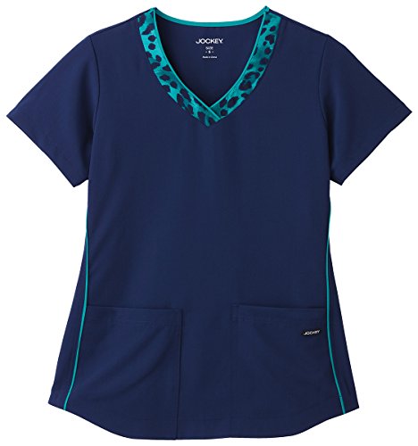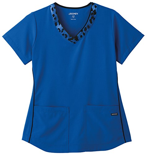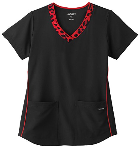 -. Binding : Apparel -. Brand : Jockey -. Department : womens -. Feature : Banded v-neckline with multi Wildcat cheetah print / Front princess seaming accented with contrast piping / Two front patch pockets with double-needle topstitching / Back shaping darts / Center back length: 26" -. Model : 2393 -. ProductGroup : Apparel -. ProductTypeName : SHIRT -. Title : Jockey Ladies Wildcat Print Trimmed V-Neck Top