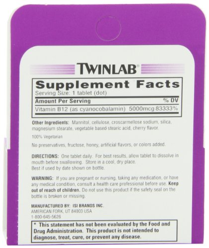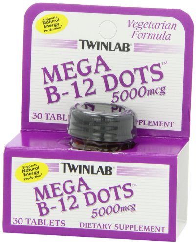 Studio : Twin Lab Publisher : Twin Lab Binding : Health and Beauty Product Description Vitamin B-12 is an essential vitamin that helps to build and maintain healthy cells, is used to create DNA, plays a role in protein and fat metabolism, and helps to support healthy energy levels.* Some people, including those with intestinal issues and older individuals, may have difficulty absorbing this important vitamin from food. Additionally, vegetarians may not get enough vitamin B-12 through their diet. Twinlab’s delicious cherry-flavored Mega B-12 Dots dissolve quickly in the mouth before swallowing to deliver 5000 mcg of vitamin B-12 that is easily assimilated for increased bioavailability. The convenient, portable-sized bottle is great on the go, so you can get your B-12 when you need it most. Our vegetarian formula is free of added gelatin and contains no added preservatives, fructose, honey, artificial flavors or colors. 0
