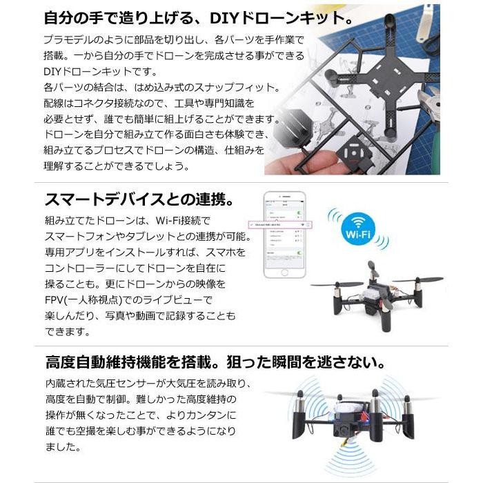 部品を切り出し、各パーツを手作業で搭載。一から自分の手でドローンを完成させる事ができるDIYドローンキットです。各パーツの結合は、はめ込み式のスナップフィット。配線はコネクタ接続なので、工具や専門知識を必要とせず、誰でも簡単に組み上げることができます。ドローンを自分で組み立て作る面白さを体験でき、組み立てるプロセスでドローンの構造・仕組みを理解することもできるでしょう。 |