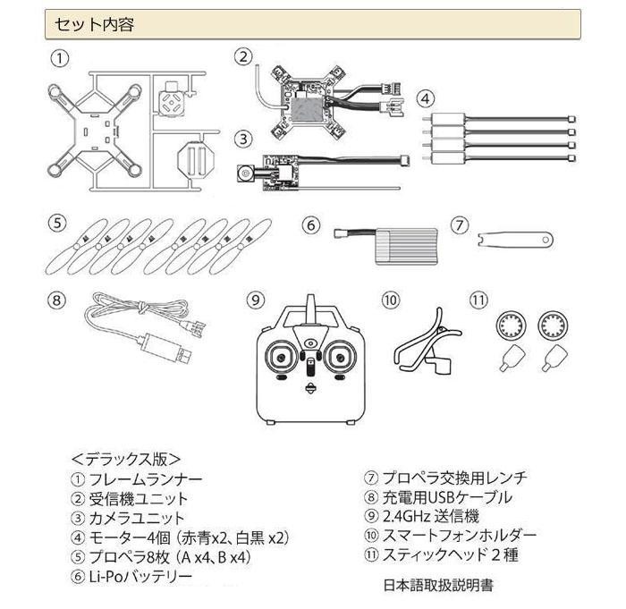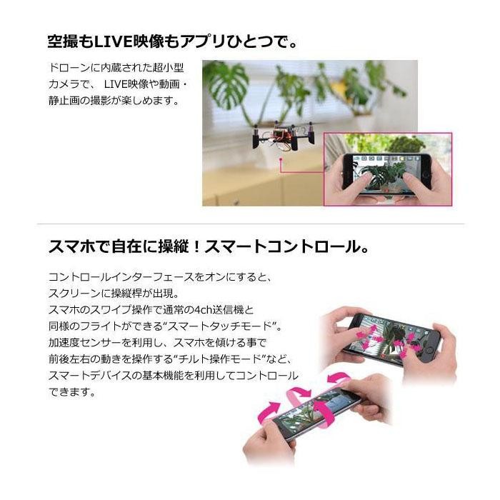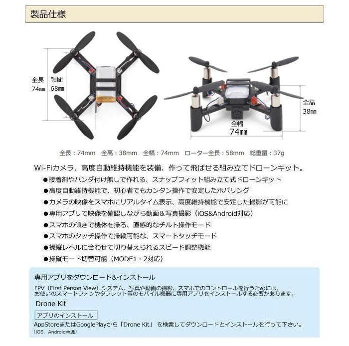 | 仕様 | 電源(送信機):単3電池×2本(別売) バッテリー:LiPo 3.7V 300mAh 充電時間:約60分(※バッテリーの状態によって異なります) フライト可能時間:約5~6分 電波到達範囲(送信機):最長およそ30m Wi-Fi電波到達範囲:およそ30m 対応端末:iOS6.0以降/Android2.2以上※iPhone、iPad、およびiPod touchに対応 組立時間目安:約30分 対象年齢:14歳以上 |